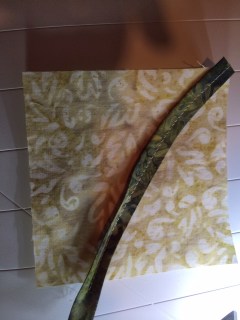 When I made the stems of the leaves I sewed on a bias strip, that I had folded in half. I folded it over again, and hand stitched it down on the opposite side. This method gave me complete control of placement, and a neat looking stem.