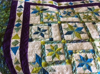 This was such a fun project to quilt. With the LeMoyne Stars, V-blocks, and Square there was such a diversity of areas to be quilted it was just fun. My previous blog (and yes it has been a while, but life gets in the way sometimes), showed the piecing of “Trade Winds”, and here I want to show some photographs of the actual quilting. I find it so disappointing when I see a beautiful quilt and the quilting doesn”t do it justice. I like everything about quilting. I could not imaging giving my quilt to someone else to finish for me. I hope my quilting inspires others to get creative and enjoy the whole process of making a quilt.