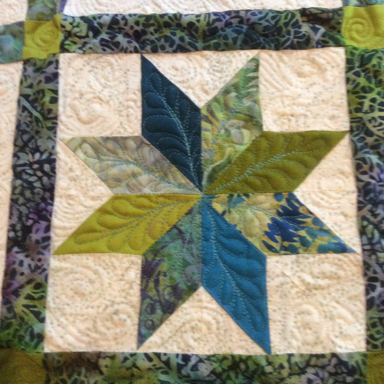 This was such a fun project to quilt. With the LeMoyne Stars, V-blocks, and Square there was such a diversity of areas to be quilted it was just fun. My previous blog (and yes it has been a while, but life gets in the way sometimes), showed the piecing of “Trade Winds”, and here I want to show some photographs of the actual quilting. I find it so disappointing when I see a beautiful quilt and the quilting doesn”t do it justice. I like everything about quilting. I could not imaging giving my quilt to someone else to finish for me. I hope my quilting inspires others to get creative and enjoy the whole process of making a quilt.