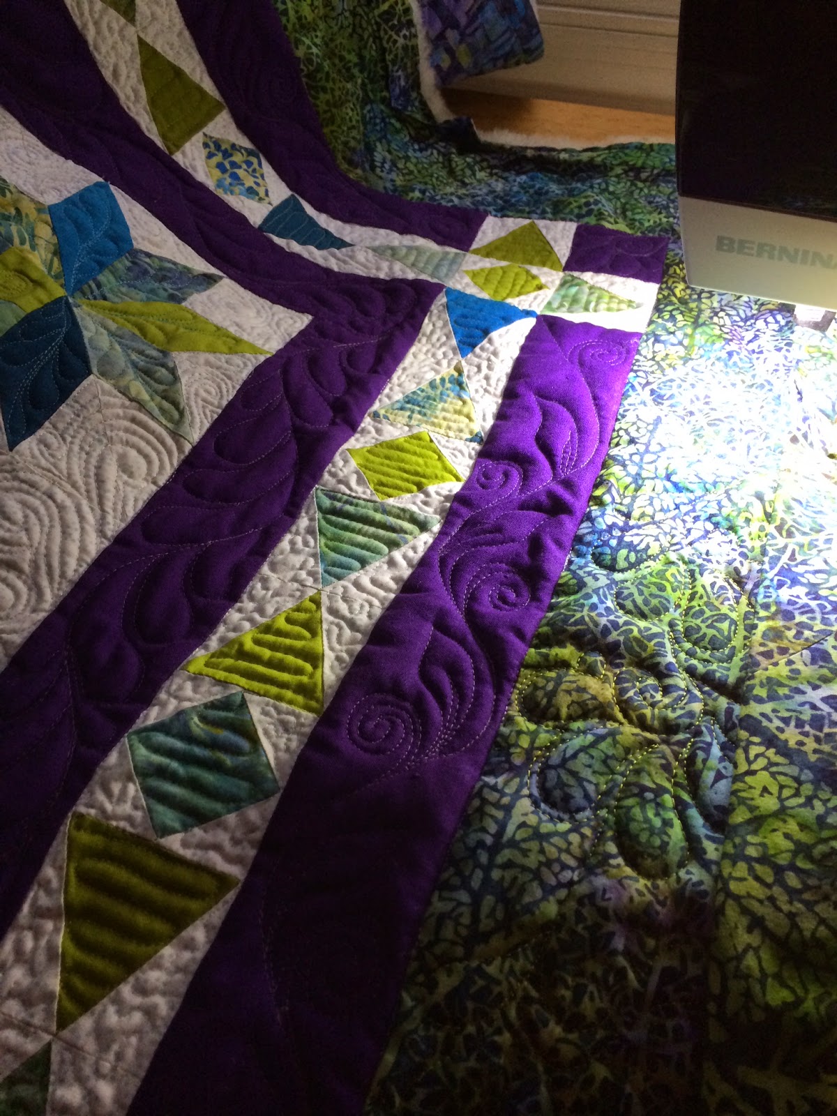 I used silk thread on the top of the quilt, and Aurifil in the bobbin. Swirls and feathers, straight line and swiggles, what fun!