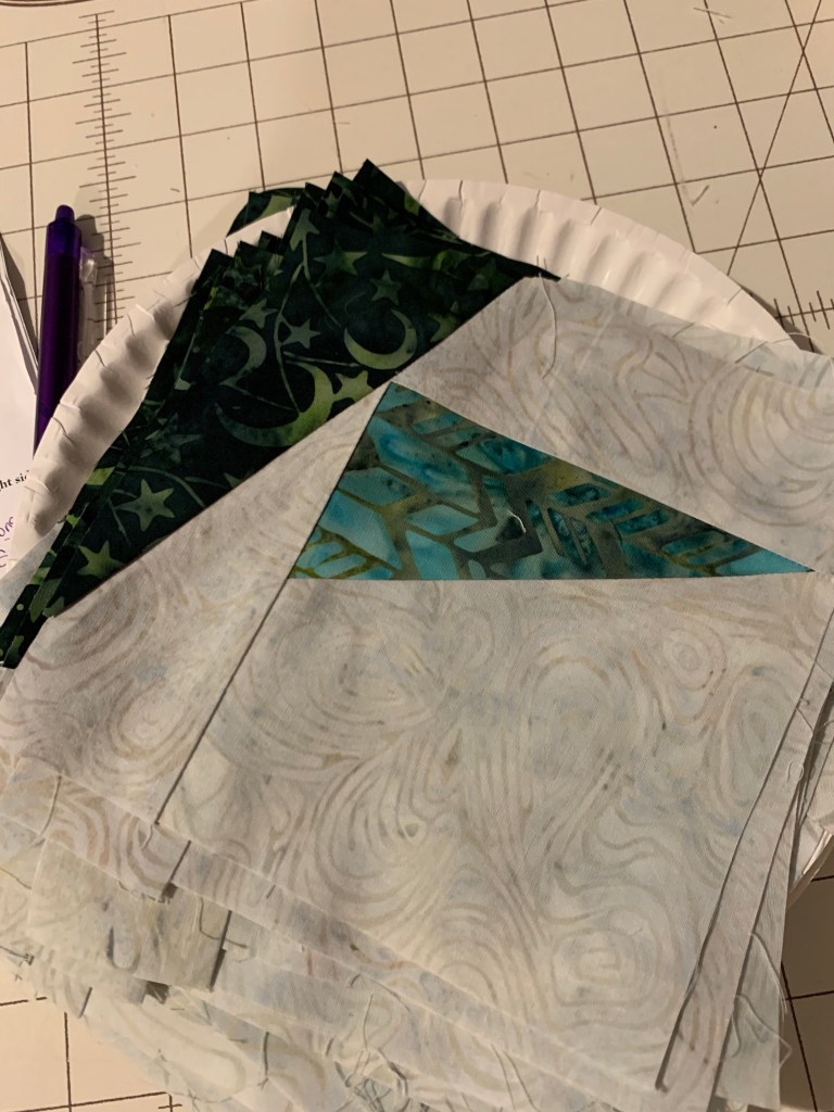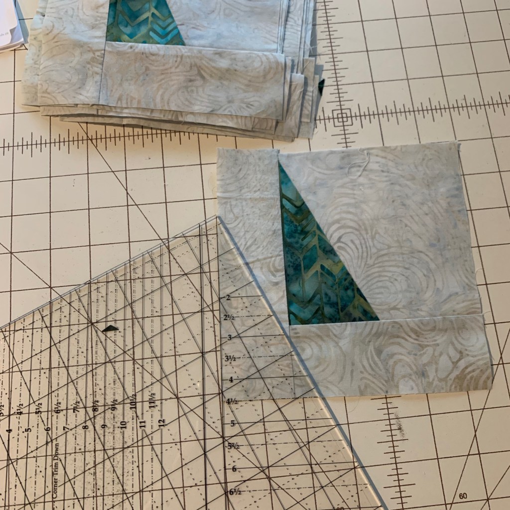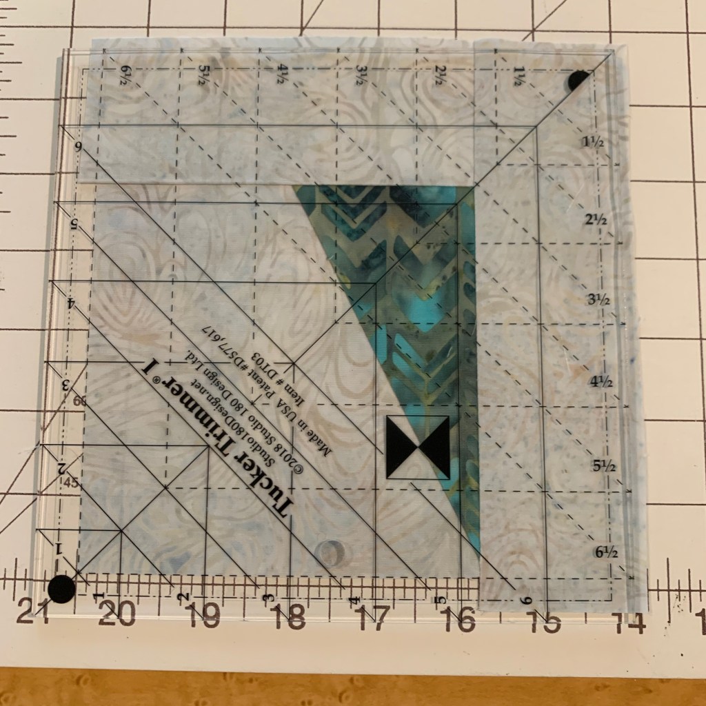 After your center block is done, you continue the process adding strips, trimming them to size, popping off the corner, and then replacing the corner with a dark triangle. I like to use the Tucker Trimmer for the squaring up process. You can chain piece too, which make the process much faster.