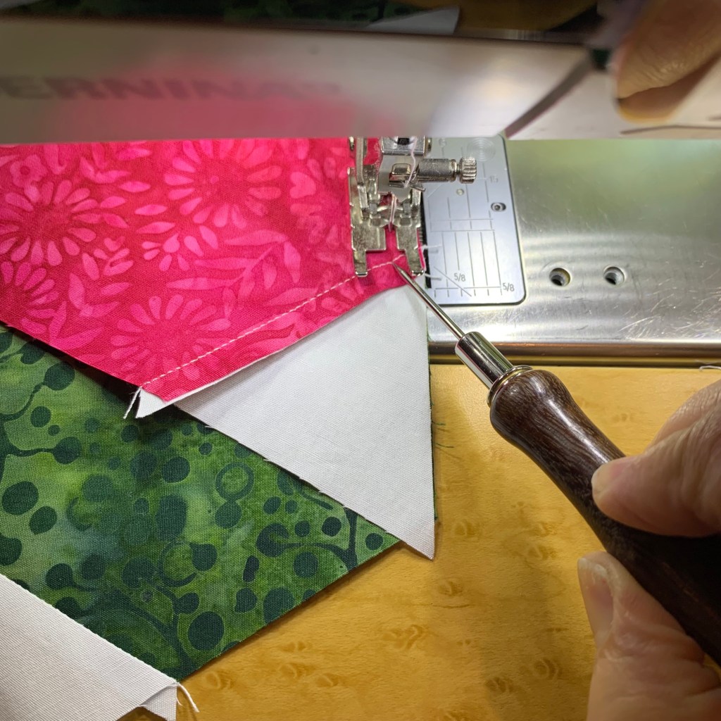 Sewing the rows together was easy. I used a stiletto to guide my piecing; I often do this instead of pinning.