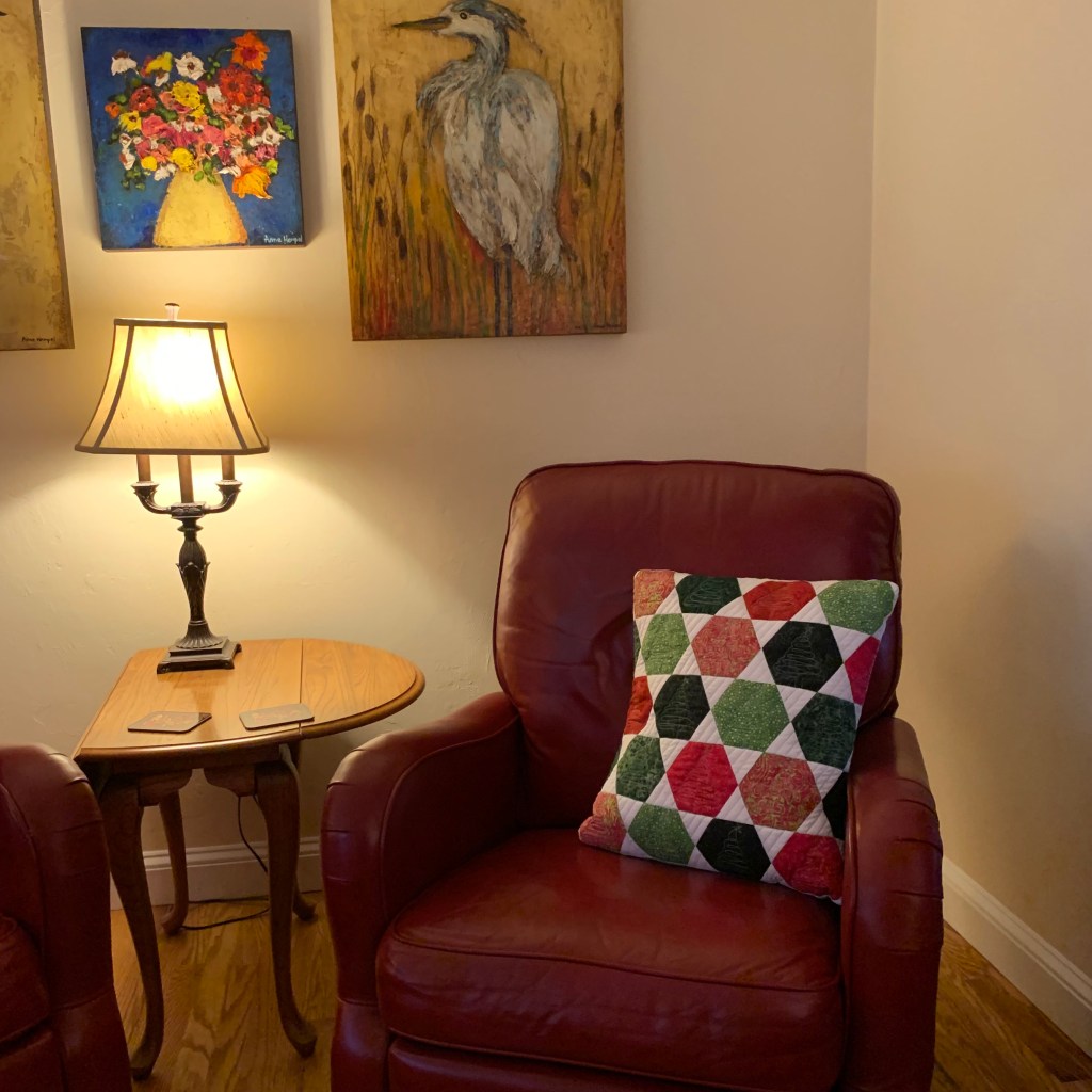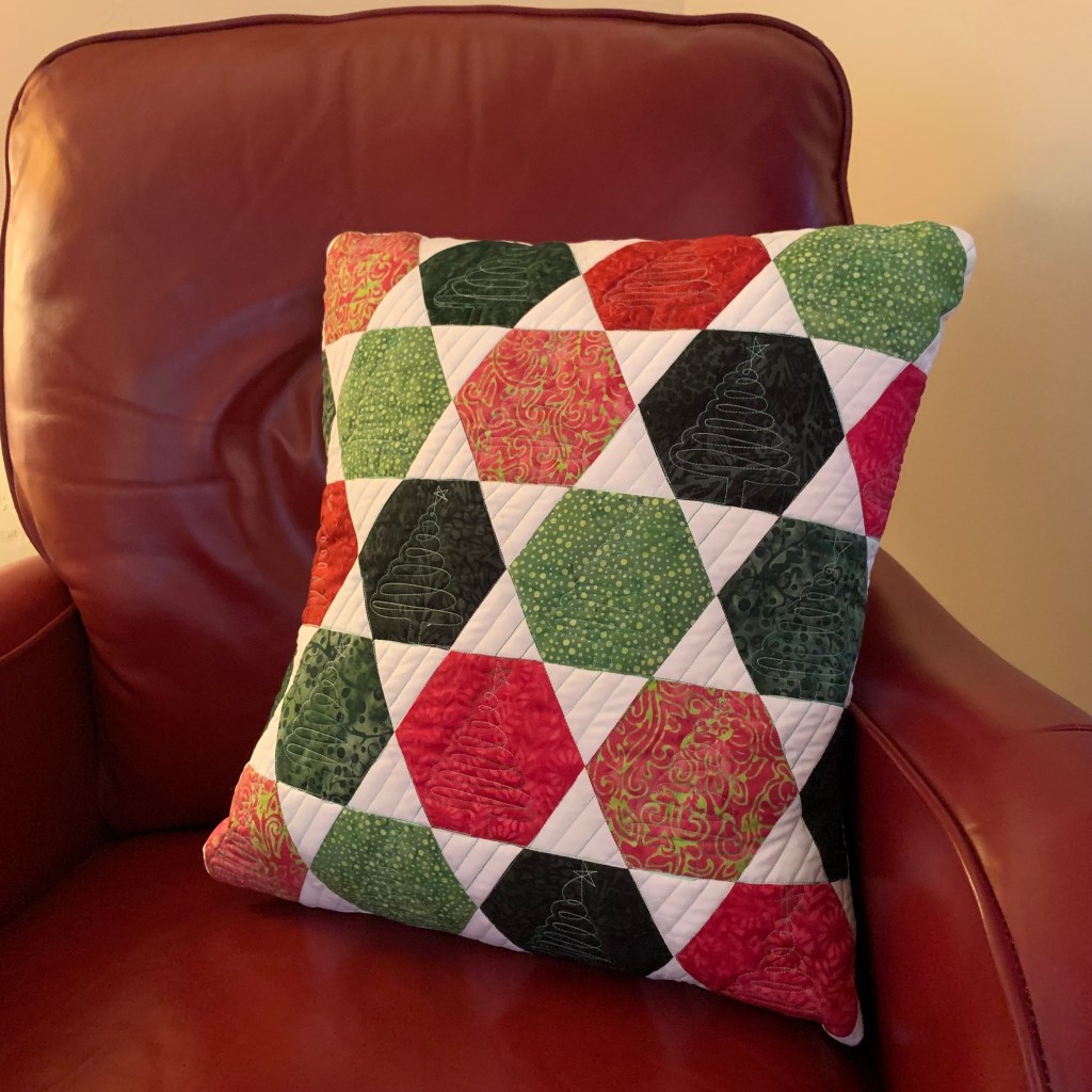 I decided to make pillows for my project. I was inspired by “Candy Dish” a pattern by little Jaybird Quilts. My first pillow I made in traditional colors, using reds and greens from my stash builder rolls, and combined them with my white, solid Island Batik fabric.