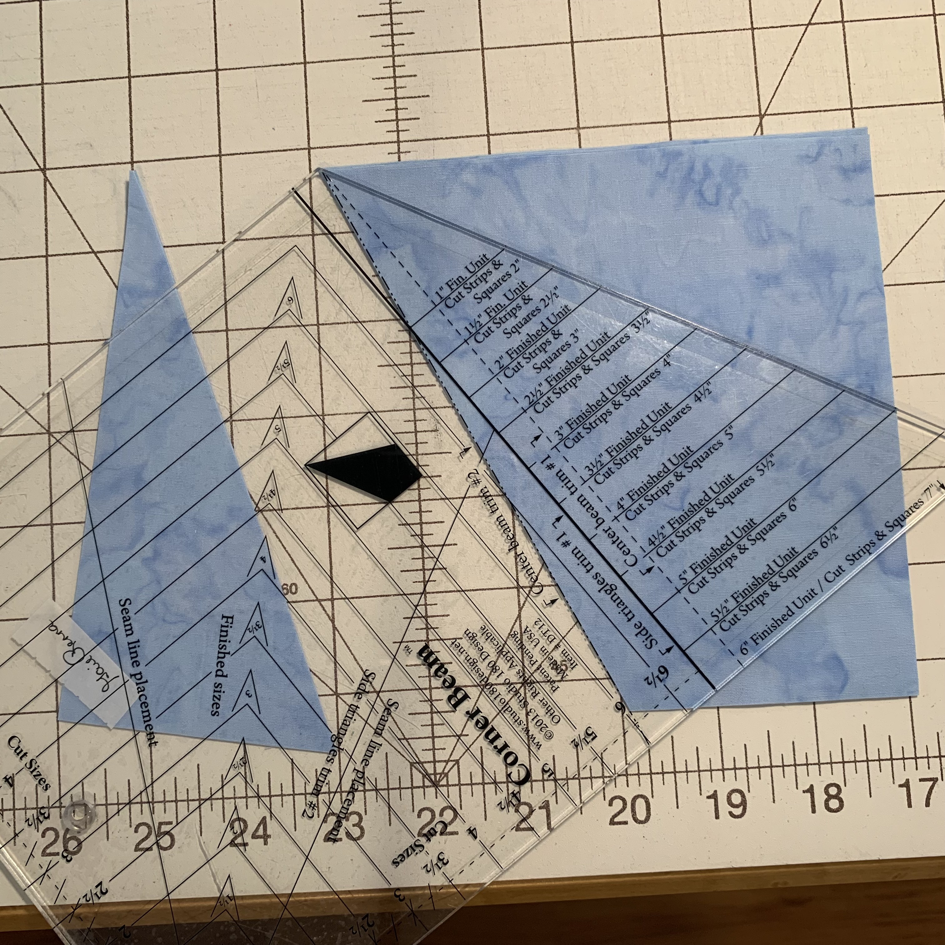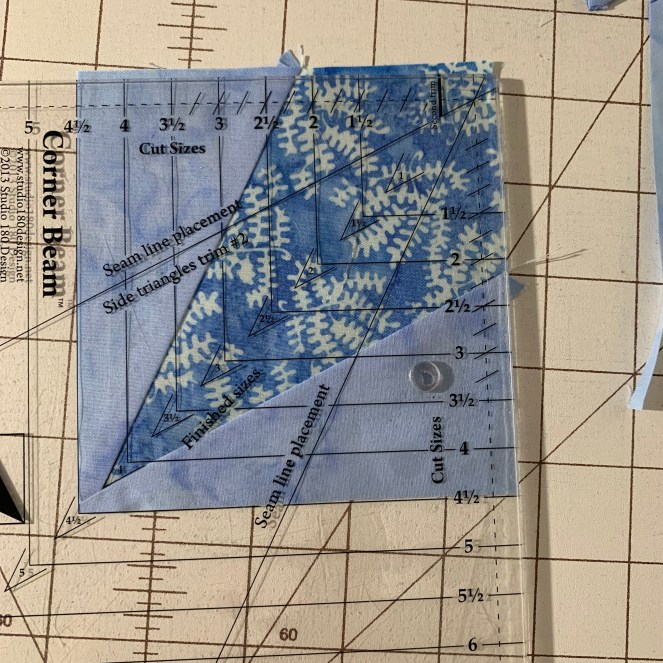 I used the Sky fabric for my center beam, which I cut into a strip and then squares. Next, I used the Corner Beam trim lines to trim away the sides. Those pieces you trimmed off? You’ll want to save them for another project. They could be side triangles for a smaller Corner Beam block or used in a Split Rects block. I love that I don’t have to throw them away. Studio 180 Design tools are very good about having minimal waste.