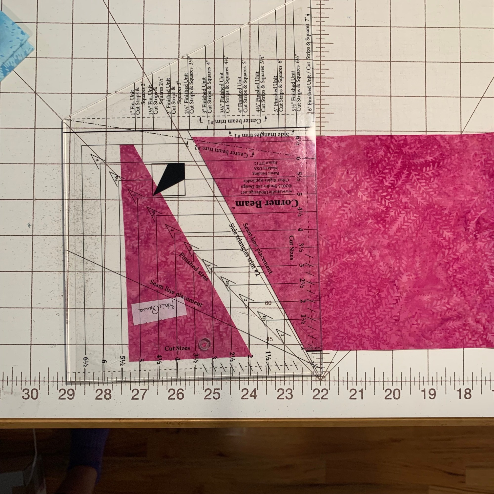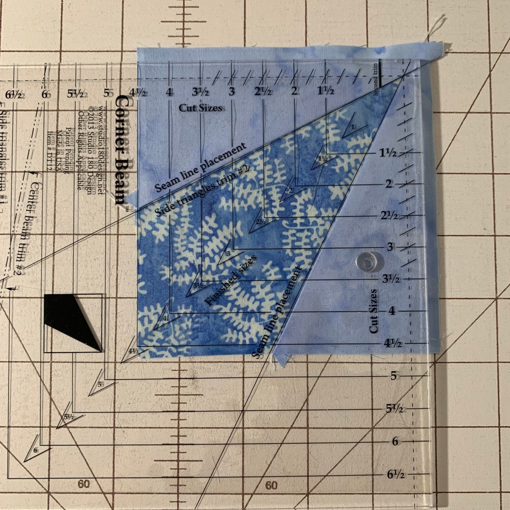 Once you have all your pieces, sew your side triangles onto your beam, and that’s when the magic happens. Your block is bigger than it needs to be so you now use the Corner Beam tool to trim your block, leaving the 1/4″ seam, and your point will be perfect.