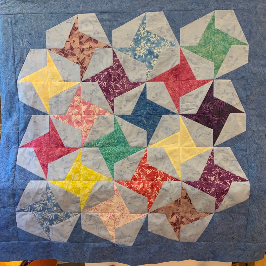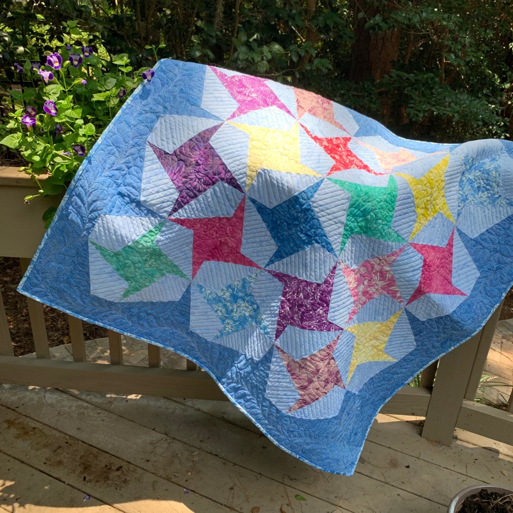 What a pretty, cheerful quilt! Island Batiks are wonderful! And I have been looking for different “kite” block designs–yours is one I will absolutely be playing with.