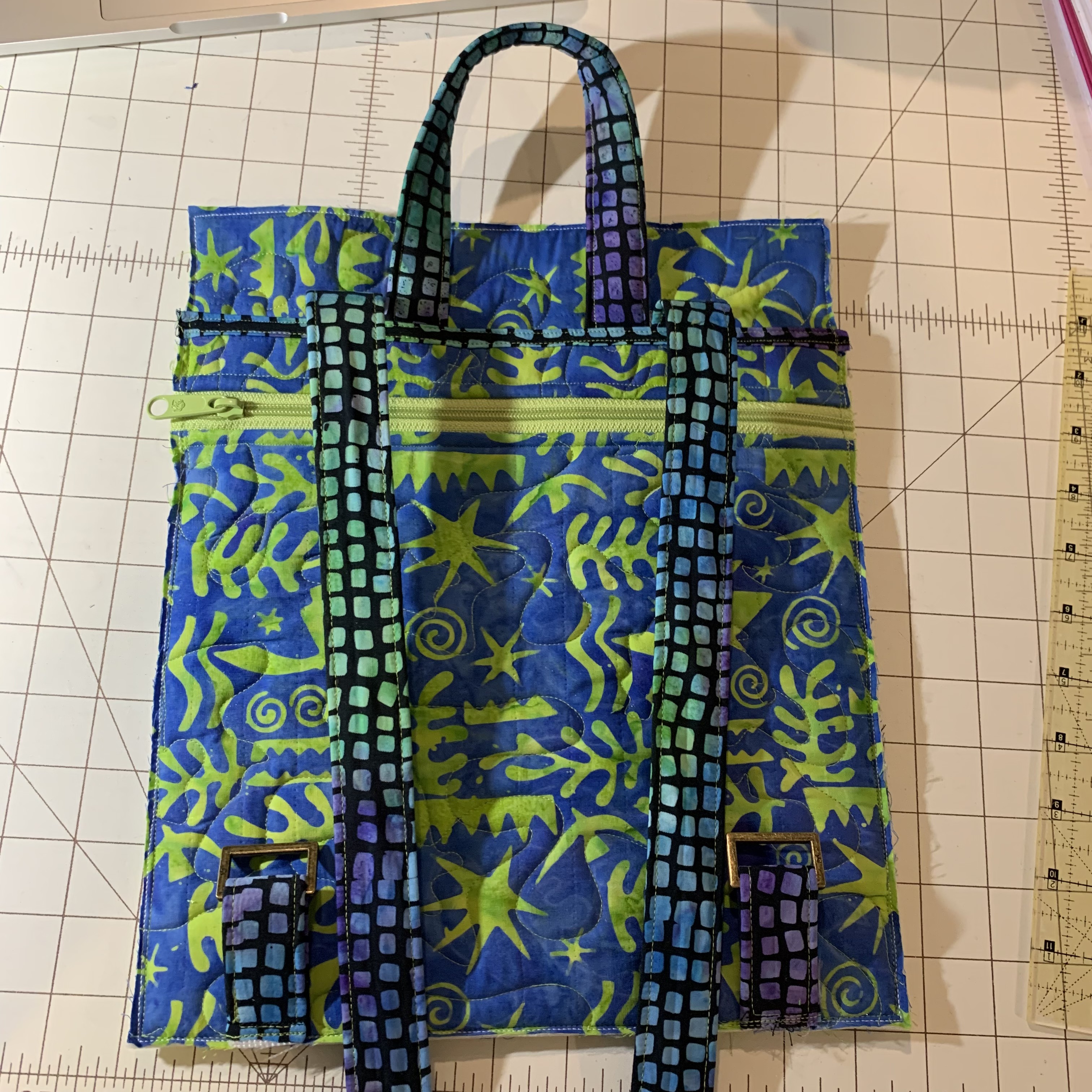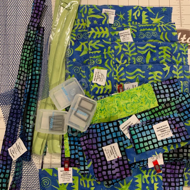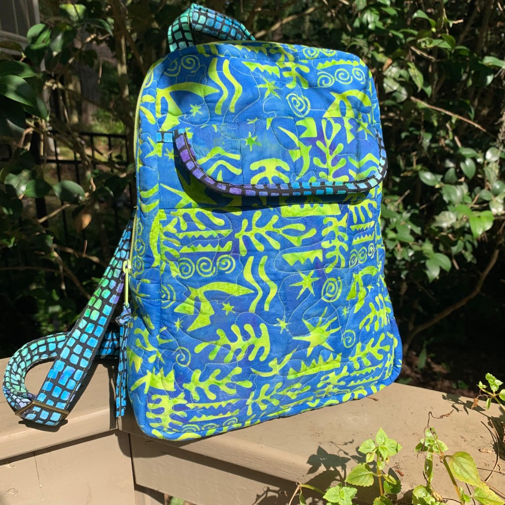 The Island Batik Ambassadors’ September challenge was to make a ByAnnie bag of our choice. We also got to choose our fabrics which was great. I picked Back At Ya 2.1 for my project. I thought the bag would be perfect for quilt shows. It would allow me to keep my hands free for shopping while providing me a bag for thread and fabric. I can’t wait to use it! The fabrics I chose were from the collection Moonlight Sky: Collage Seedling for the main part of my bag and Square Marbles for the trim. For the lining, I chose Foulard-Apple from the Blender fabrics. I love that green!