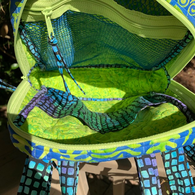 The Back At Ya 2.1 bag has an outside zipper pocket, pockets for your credit cards that has a magnetic closure, an inside mesh pocket, and cloth pockets. Plenty of places for your phone, your credit cards, wallet, and, of course, all your purchases of thread, fabric, needles, patterns, etc.