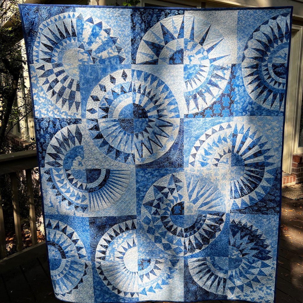 The fabric I used is “Winter Sky” by Kathy Engle. It is being sent to shops currently.