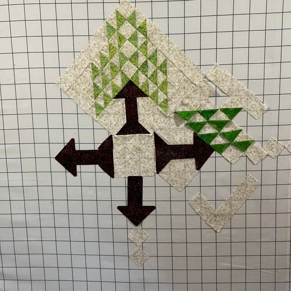I used Island Batik’s Foundation fabrics, Bermuda, Apple, Large Netting Lemongrass, and an orange fabric I pulled from my stash builders. It was bright and cheerful. I also used, Eggshell, for the tree background and, Butter, for the outer background.