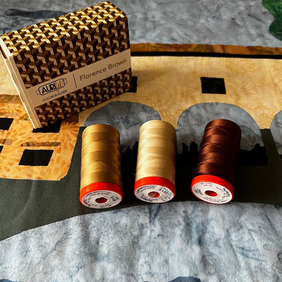 For our challenge this month, the Ambassadors were sent an Italy-themed Color Builder box by Aurifil. I was sent Florence Brown containing three shades of brown (#2312, # 6010 and #2360) in 50 weight. We were to use all three colors in our project of thread painting, appliqué, or a combination of the two. Florence… Continue reading Italian Color Builder Challenge