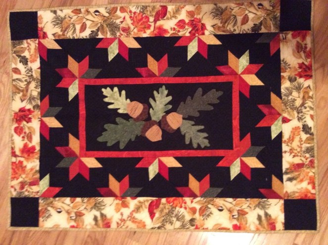 This is a great fall project. The table runner is made with the Corner Beam and Wing Clipper I rulers from Studio 180 Design. Mine was done in Batiks, but you could use some of the beautiful fall fabrics.